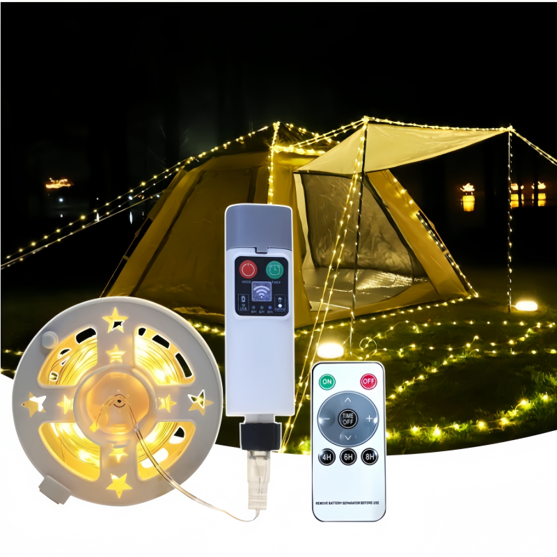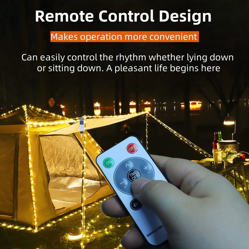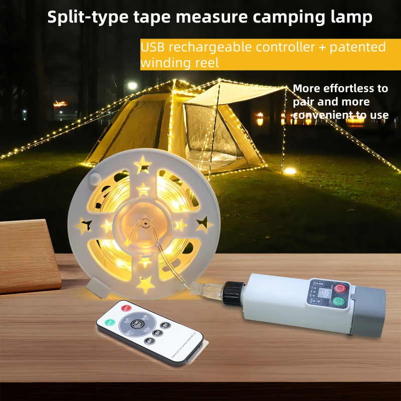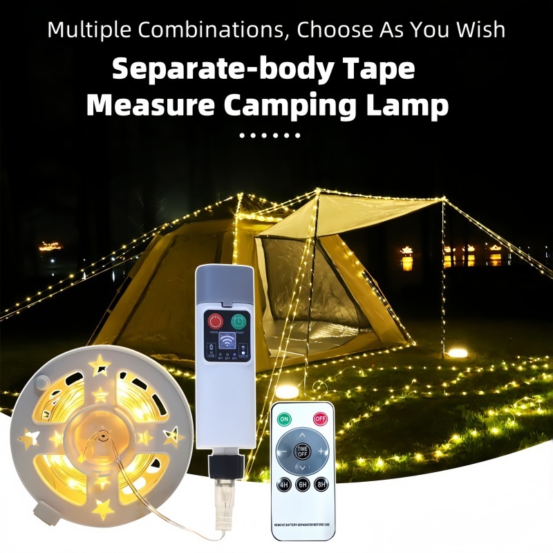 This camping lamp features a unique tape measure-style storage design, allowing the light string to be freely stretched to the desired length, eliminating concerns about cable tangling or storage inconvenience. The split-body structure separates the light string from the control module, enabling you to arrange the light strings inside and outside the tent, along garden paths, or combine multiple sets to create layered lighting effects. Whether creating a warm atmosphere inside the tent or enhancing the romantic setting of an outdoor party, it excels in every scenario.