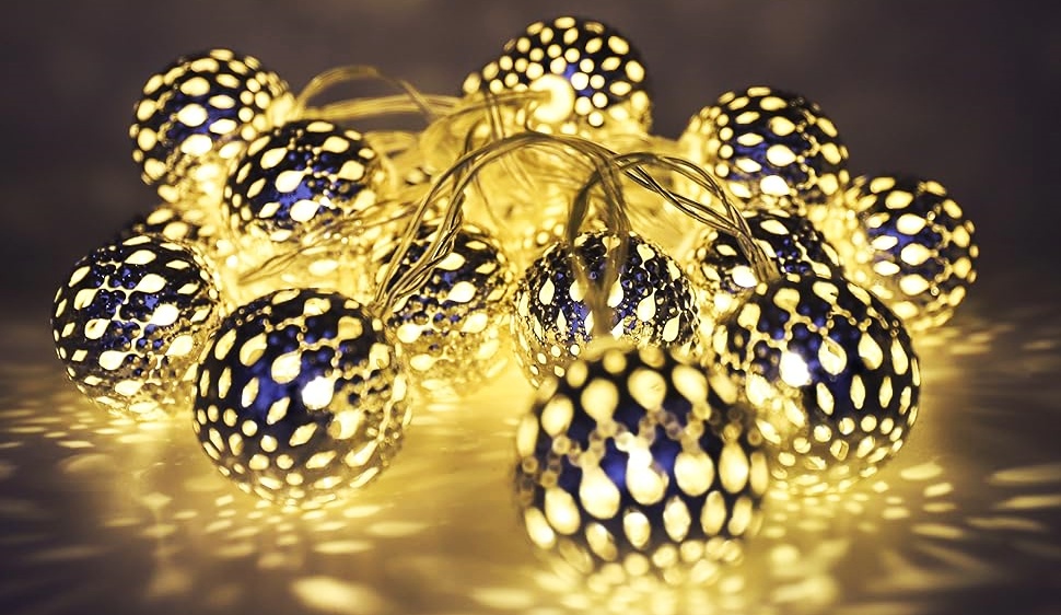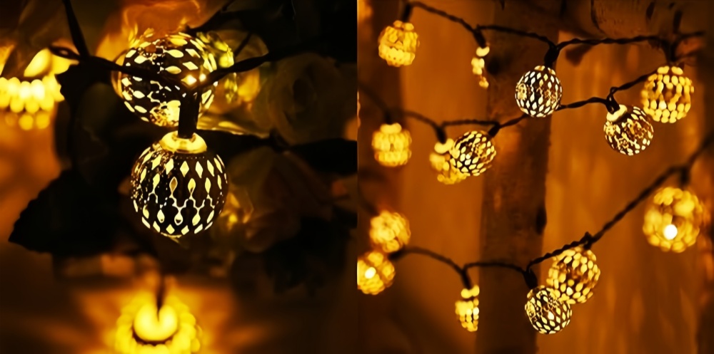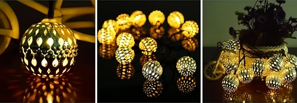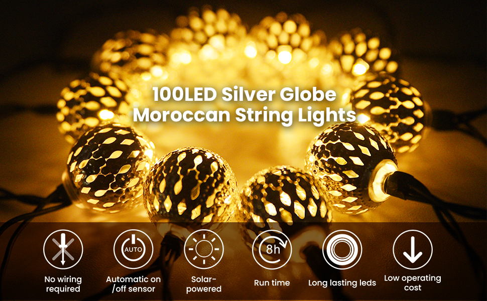 Decorative silver Moroccan LED string lights, with new light pattern, silver carved light bulb, decorate both day and night. Hang up for party, wedding, Thanksgiving, Christmas or holidays to make the day different.