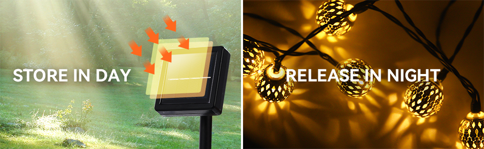 The solar string light panel is light-sensing, please make sure there is no light source such as the street lamp shines on the solar panel when you need the item in working status;Working time depends on sunlight.