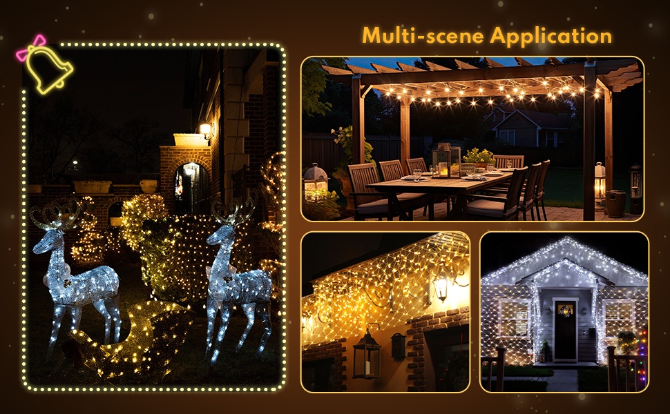 Very easy to use, unroll the net string lights then mount it at the place where you want to decorate, do it by yourself and enjoy the fun! Create instant ambiance inside or outside your home with our Christmas tree lights. The string lights quickly creates a relaxing, memorable atmosphere—perfect for everyday decor or social gatherings like a Christmas party,outdoor wedding, summer evening soiree, or casual backyard barbecue.