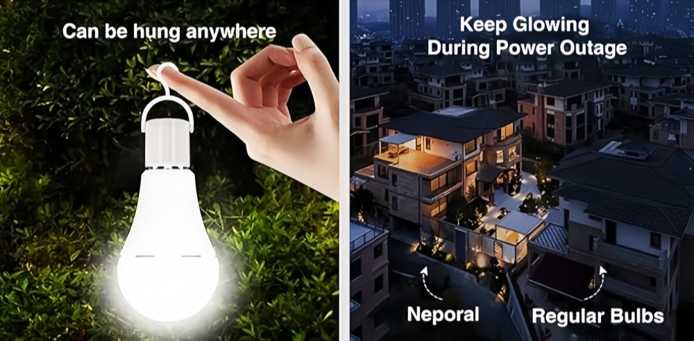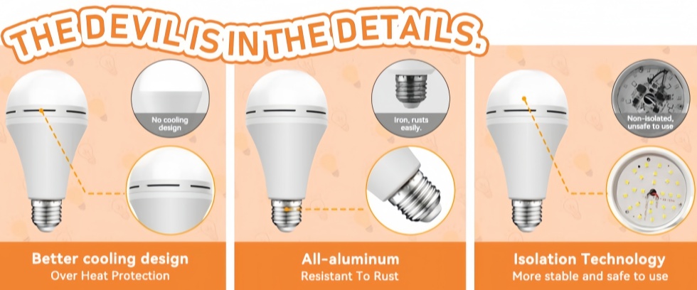 Rechargeable emergency light bulb is suitable for any light fixture with E27 threaded base, 9W LED bulb provides 6500K white light, this battery-powered bulb use less energy and last longer.