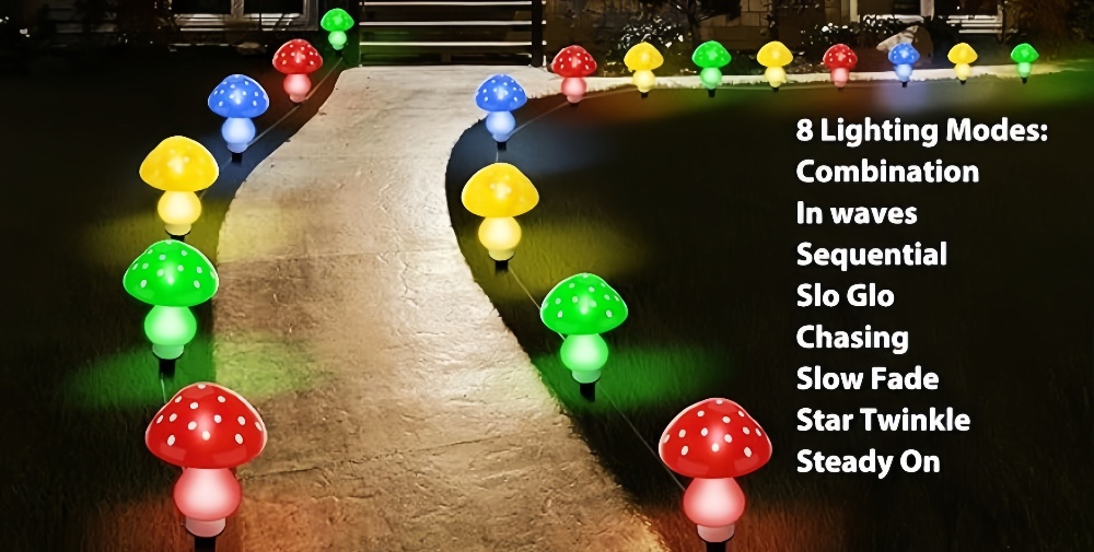 Here are 4 leds in each mushroom, bright and beautiful, looking fantastic as soon as they light up and can last all night. Mushroom lights have 8 different modes of preferences and you could change the patterns of light, including 1 stay ON mode and 7 dynamic modes.