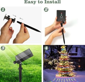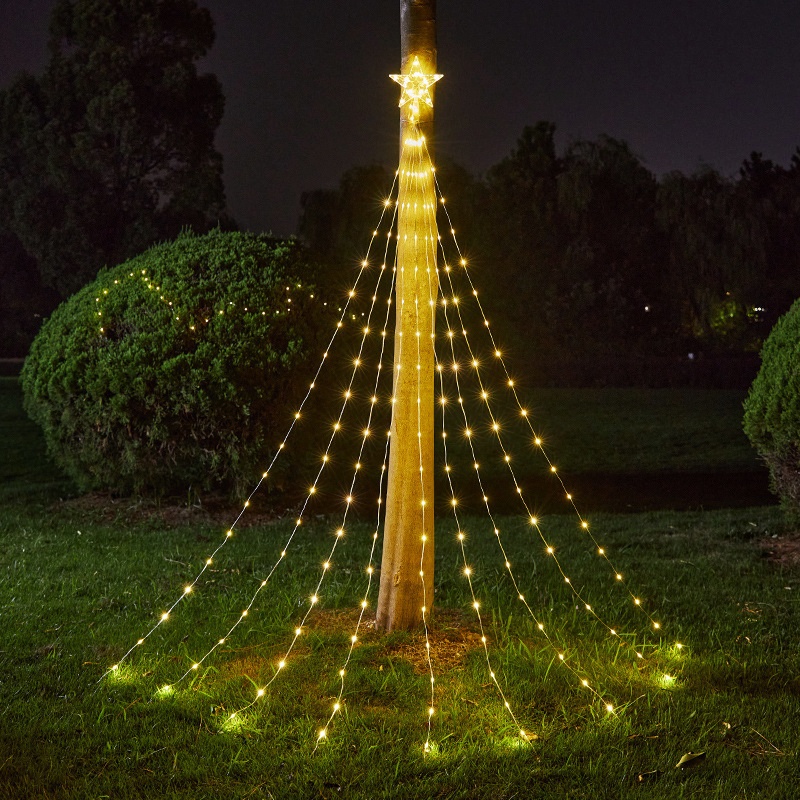 Start by hanging the star on the top of your tree. Then attach the nine lines of little star lights to the biggest star and let them drape to the ground, following the shape of the tree. It looks like a star glittering in the night sky. It will be a beautiful addition to your outdoor decorations.