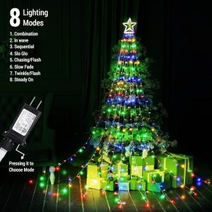 Work great with trees from around 8 feet to 13 feet tall. Just hang the star topper up on the top of the tree, then drape the 9-string lights on the branches/ground or fix them with metal inserts, following the shape of the tree.(Two modes,Pulg/Solar)