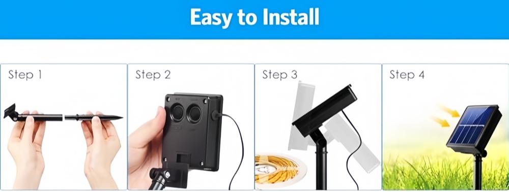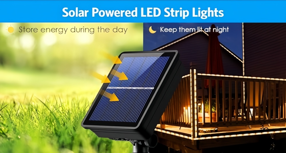 The solar light strip is equipped with a smart remote control. It can also be turned on remotely to change settings during the day, and the lights will automatically turn off 1 minute after the settings are completed. The set mode has a memory function, automatically lights up every night and turns off automatically during the day.