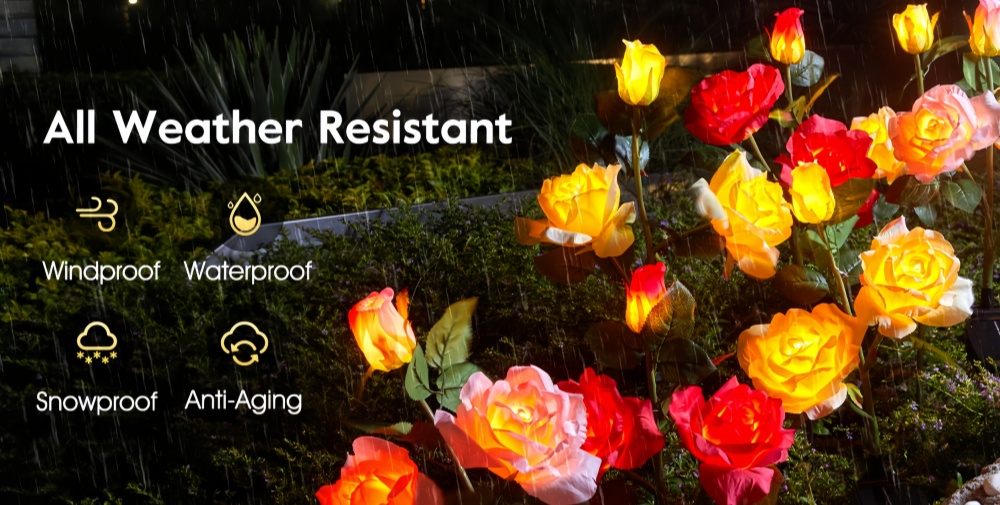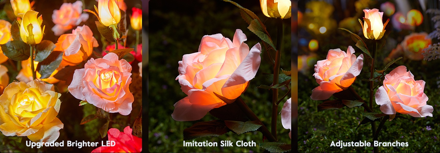You will get 4 pack different colors of solar rose lights including red, blue, pink and yellow. They have 5 heads of vivid roses and foliage that look realistic from a distance during the day and are a great addition to your garden decor. And at night, it can light up your garden, making your patio porch more beautiful and dynamic.