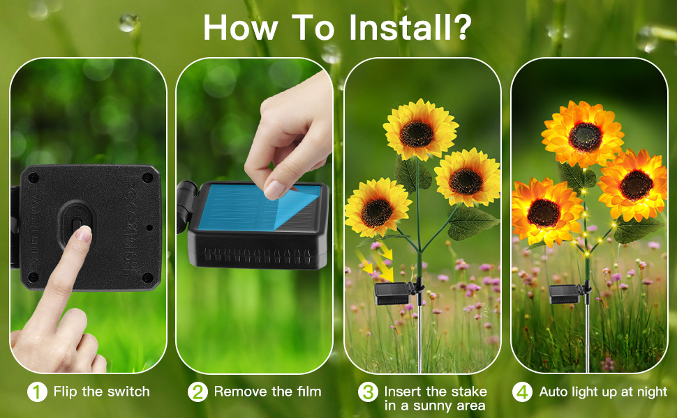 Slide the switch to “ON”, attaching the lights to the metal sticks provided and then plant them into the soft areas ground. During the day, the solar panel absorb energy automatically, and lighting automatically according to the sensors at night. Take it to go camping!