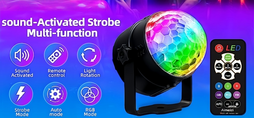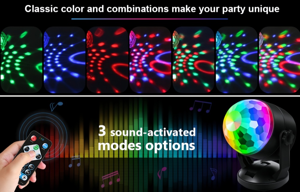Easily change the color, mode and rotating speed of these Party Disco strobe light for parties with a simple press of a button.The included remote controls allow you to choose among three sound-activated modes, seven lighting modes and rotation speed.
