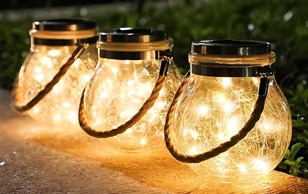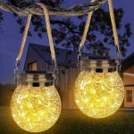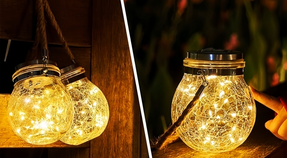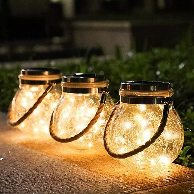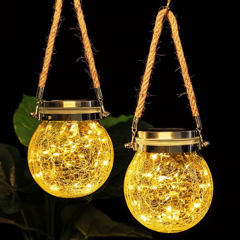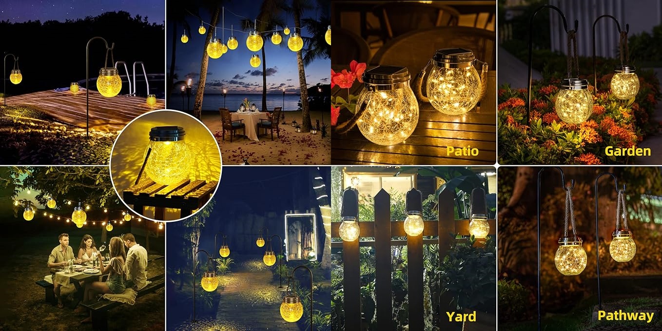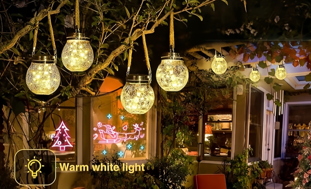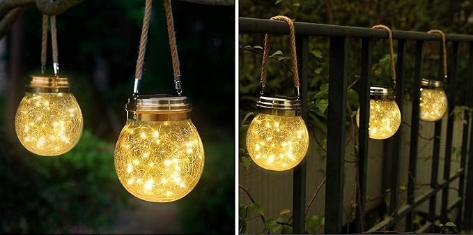 Each of our 6 pack hanging solar lights has 30 Leds, which are beautiful and bright in every occasion. (6 Crack Jars+6 Lid Lights+6 Hangers, Crack Jar Dimension: 11.5 X 14.5 cm). Ideal for home, balcony, fence, driveway, Christmas tree decoration.