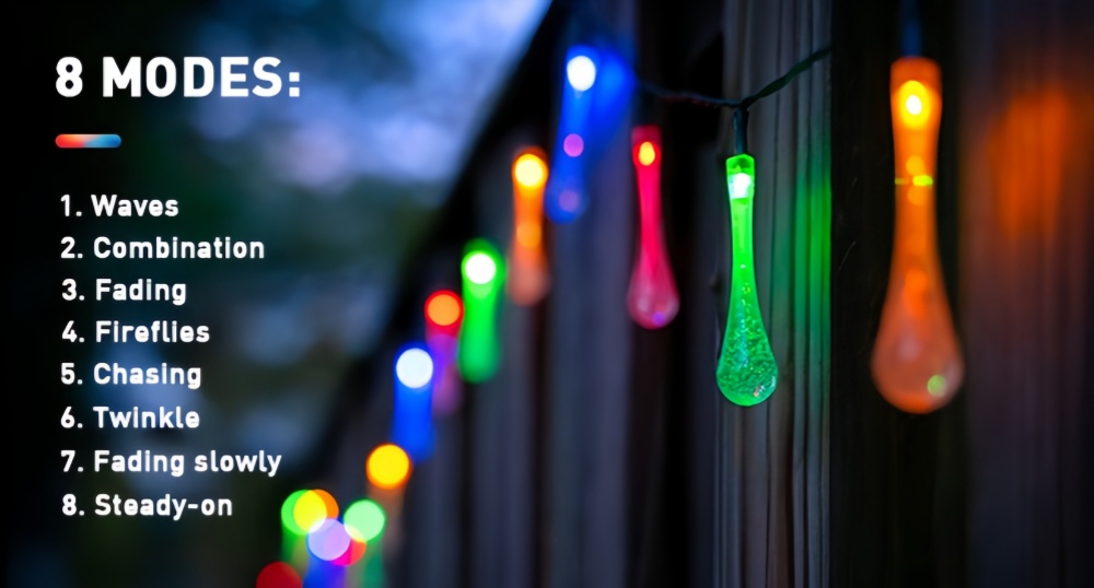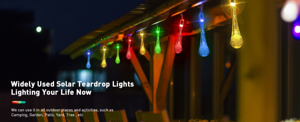 Charged with solar energy, eco-friendly and without electric cost, the battery can last to work more than 18 months. Light sensor controls the teardrop solar garden string lights auto keeping on lighting 7-8h at dark and auto off at daytime.