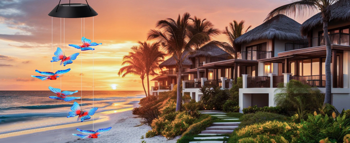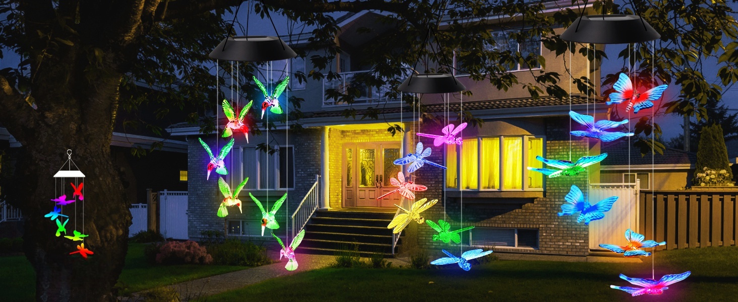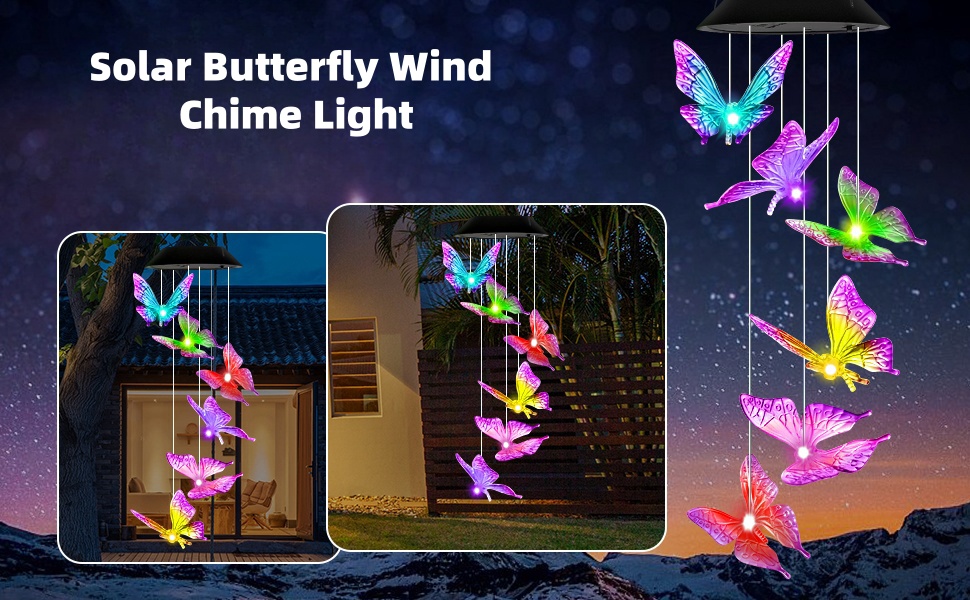 Color Changing Butterfly Solar Lights :Color changing butterfly wind chime lights will light up automatically in the dark and glow on different colors in turns,calmly and softly changing from one color to the next, bring joy and color to your life.