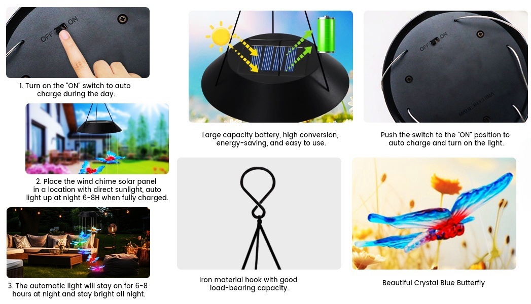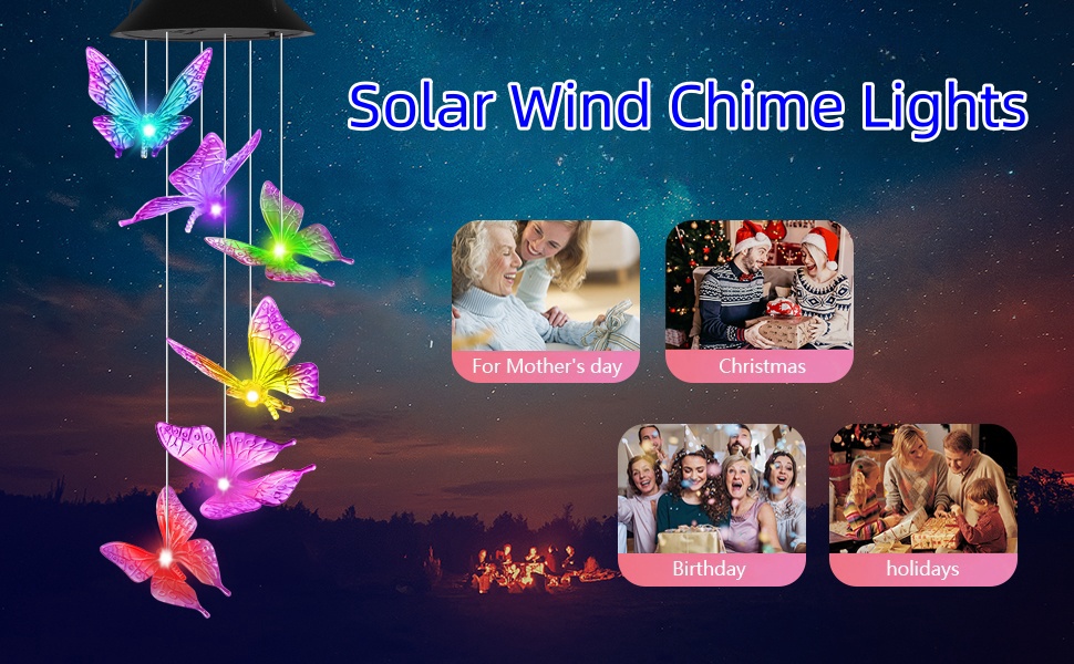 Indoor & Outdoor Decorative Mobile:The waterproof solar outdoor decorative lights butterfly wind chimes can be hung indoors and outdoors as a lovely day and night decoration, hear wind during the day and glowing as a nightlight after dark. Nice for lawn, garden, patio, yard, hall, roof, living room, bed room decoration.