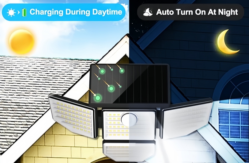 The led flood light motion detected spot light is equipped with high-efficiency solar panels and 2400mAh rechargeable batteries. It charges automatically during the day and starts working in the dark. Please install solar light in the sun to effectively charge the battery.