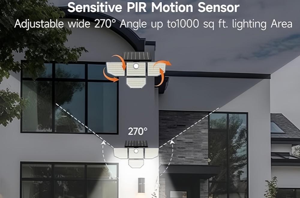 Our led flood light motion detected spotlight outdoor feature 4 adjustable heads that can be directed up, down, and horizontally. The solar lights with 120-degree wide-angle coverage have sensitive motion sensors that can detect distances up to 39 feet, allowing for wider illumination and more visibility.