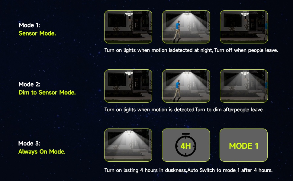 Mode 3: The light always maintains medium brightness at night, and mention sensor turns on after four hours.Different lighting modes to meet your different needs.